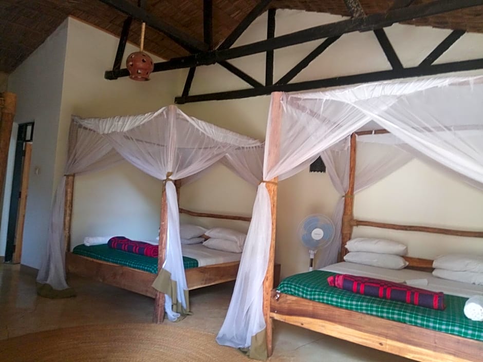 The spacious family room offers a private entrance, a seating area, a balcony with garden views as well as a private bathroom boasting a shower. The unit has 4 beds.